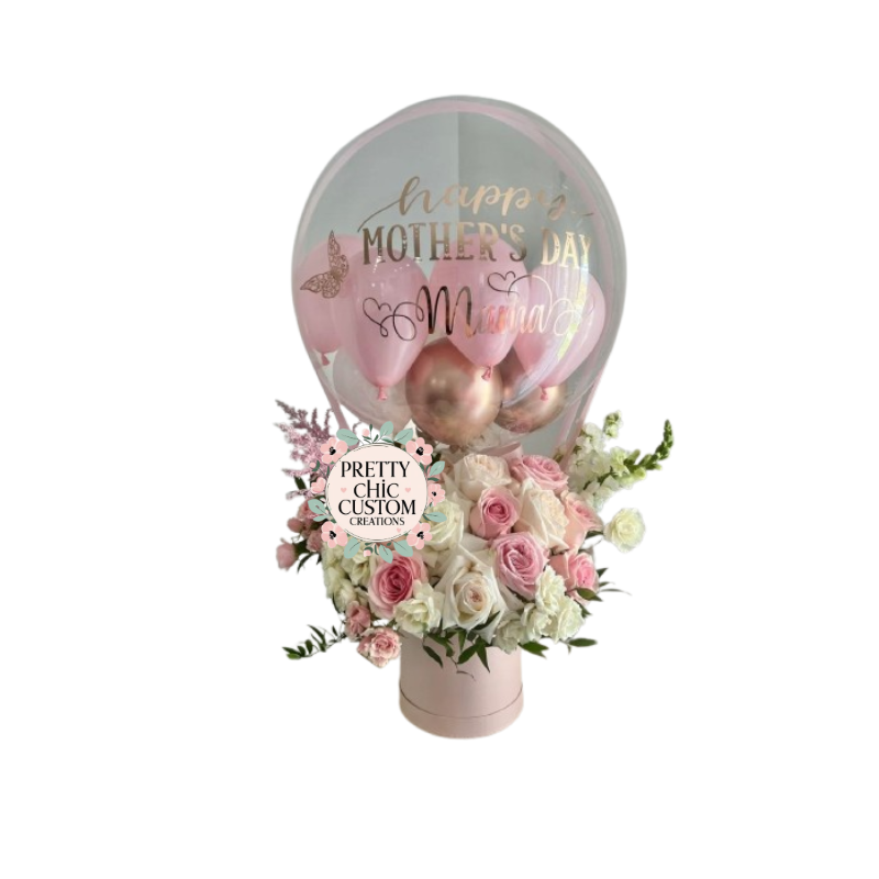 Make Mother’s Day extra special with our elegant hot air balloon gift box, designed for you to fill with your own hand-picked gifts. This unique Mother’s Day balloon box features a stunning balloon arrangement attached to a stylish gift box, creating a show-stopping presentation.