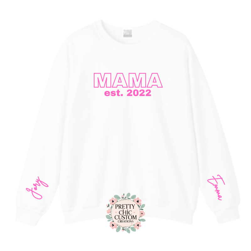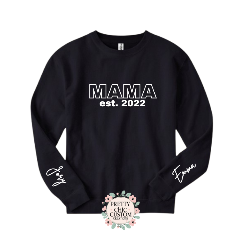 Made from a comfortable 100% polycotton blend, this classic fit sweater offers the perfect balance of softness, durability, and everyday wearability. Each piece features “MAMA, est year” across the front, with your children’s names personalized along the sleeve for a heartfelt and unique design.