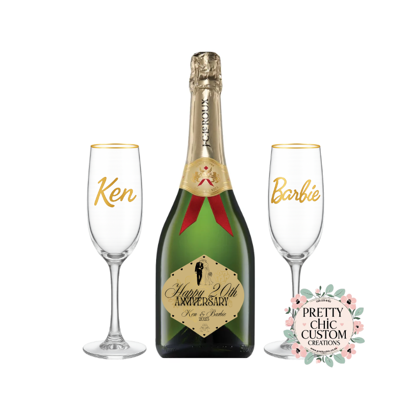 This exquisite set includes a champagne/wine beautifully presented with two champagne glasses customized with names, dates, or special messages of your choice.